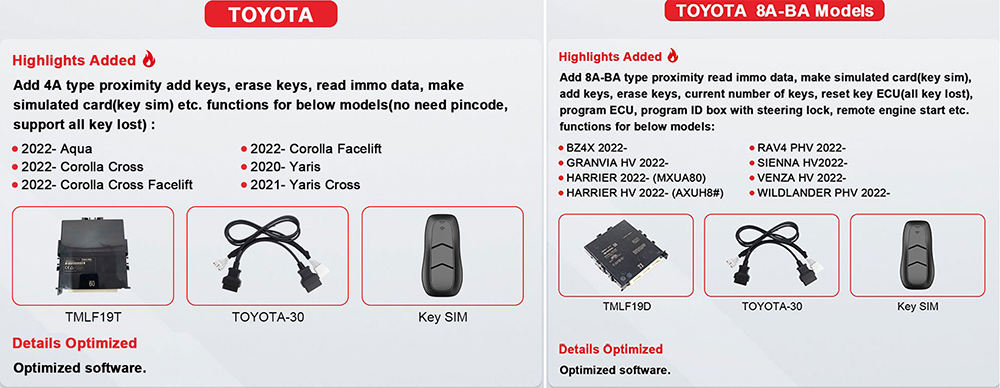 4. Used for all keys lost and password-free matching operation of 8A-BA and 4A models of Toyota's latest smart key box with 30 pins.
